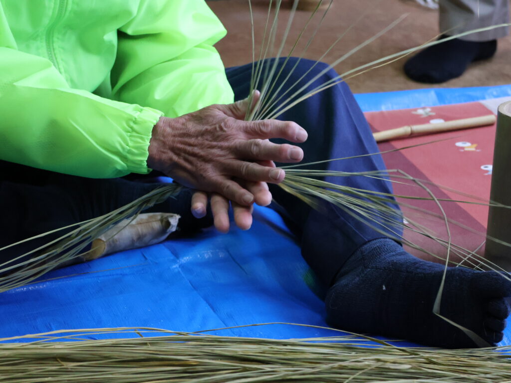 使う藁は古代米といわれる昔ながらの品種、赤米よりも柔らかい黒米のわらを使って作るそうです。この黒米も作る方がどんどん減っており、わらを入手するのも一苦労とのこと。