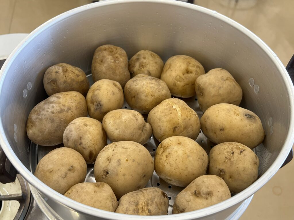 いもフライの材料はじゃがいも、小麦粉、パン粉、お水です。思ったより少ない材料でできるのが手軽ですね。じゃがいもを串に刺す時に崩れないように、蒸かしてから一晩寝かせたじゃがいもを使います。友の会S・Cフラワーズの皆さんが前日準備にも参加し、じゃがいもを蒸かしていきました。もちろん電子レンジで蒸かすこともできますが、蒸し器だとよりおいしくなりそうですね。