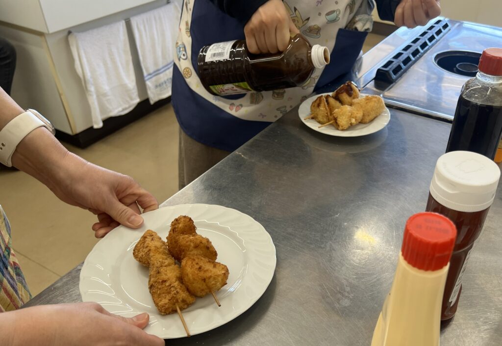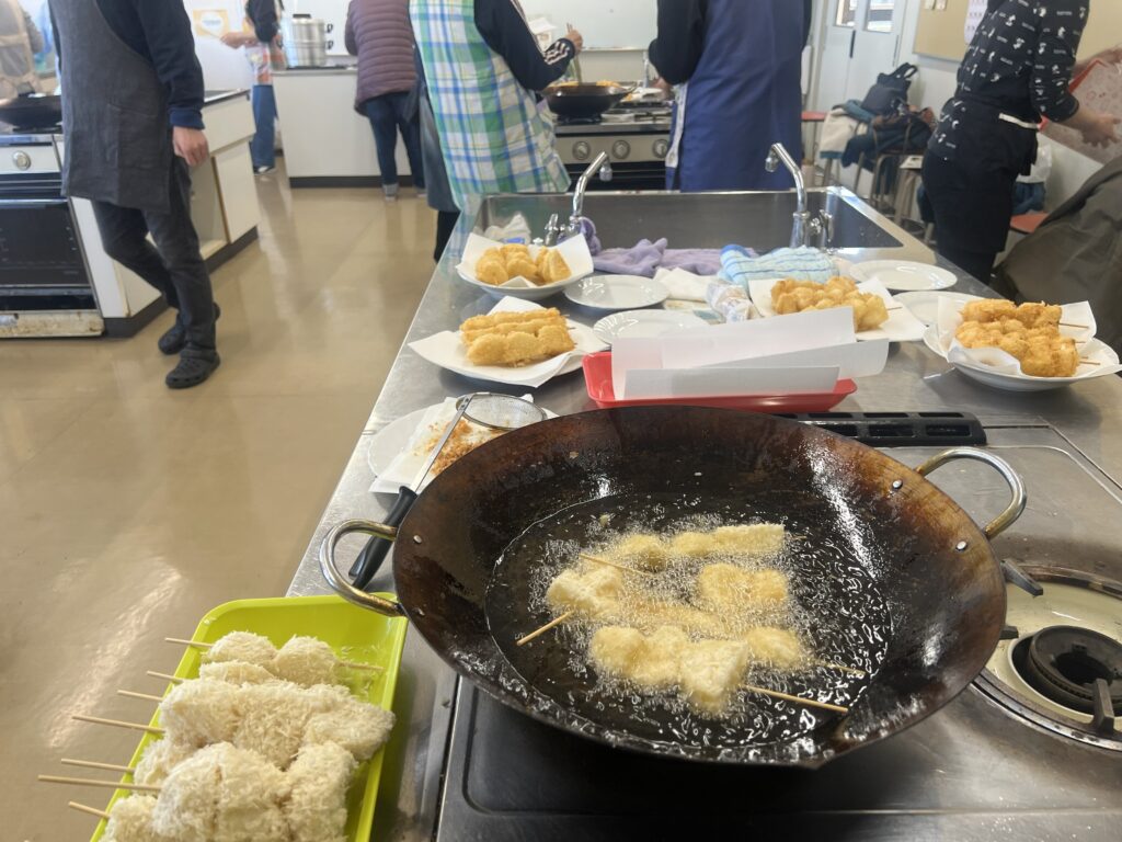 皆さん手際よく、串を刺し、衣をまとわせ、揚げていきます。いたるところからじゅわ~っという音と香ばしい香りが実習室からあがります。小学生から大人まで、さまざまな年齢層の方が集まりましたが、協力しあいながら楽しく調理を進めていました。