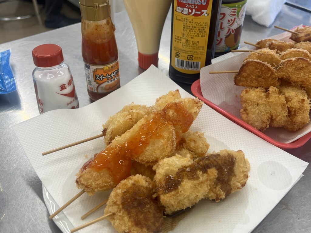 いもフライがどんどん揚がる中、今度は味付けにも悩みます。オーソドックスなソースは佐野市で製造されているミツハフルーツソースとマドロスソース。ケチャップやからし、塩などもご用意しました。皆さん思い思いにカスタムを楽しみます。