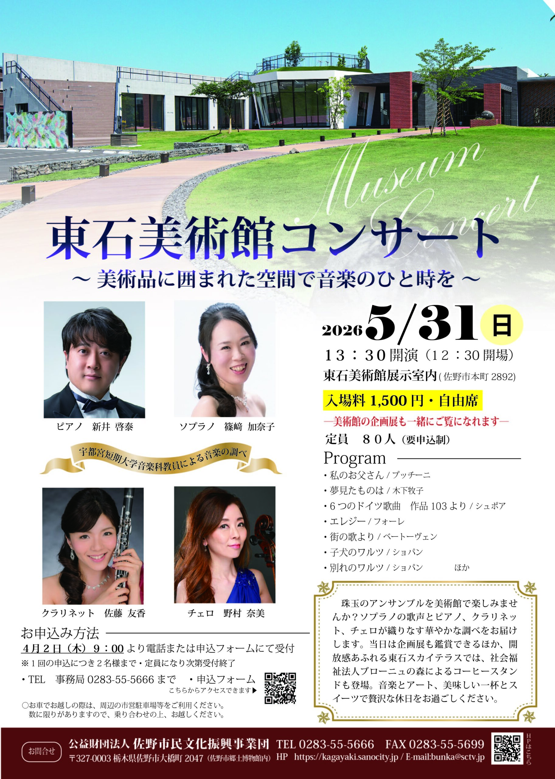 佐野市民文化振興事業団では5月31日(日)に、東石美術館においてコンサートを開催します。